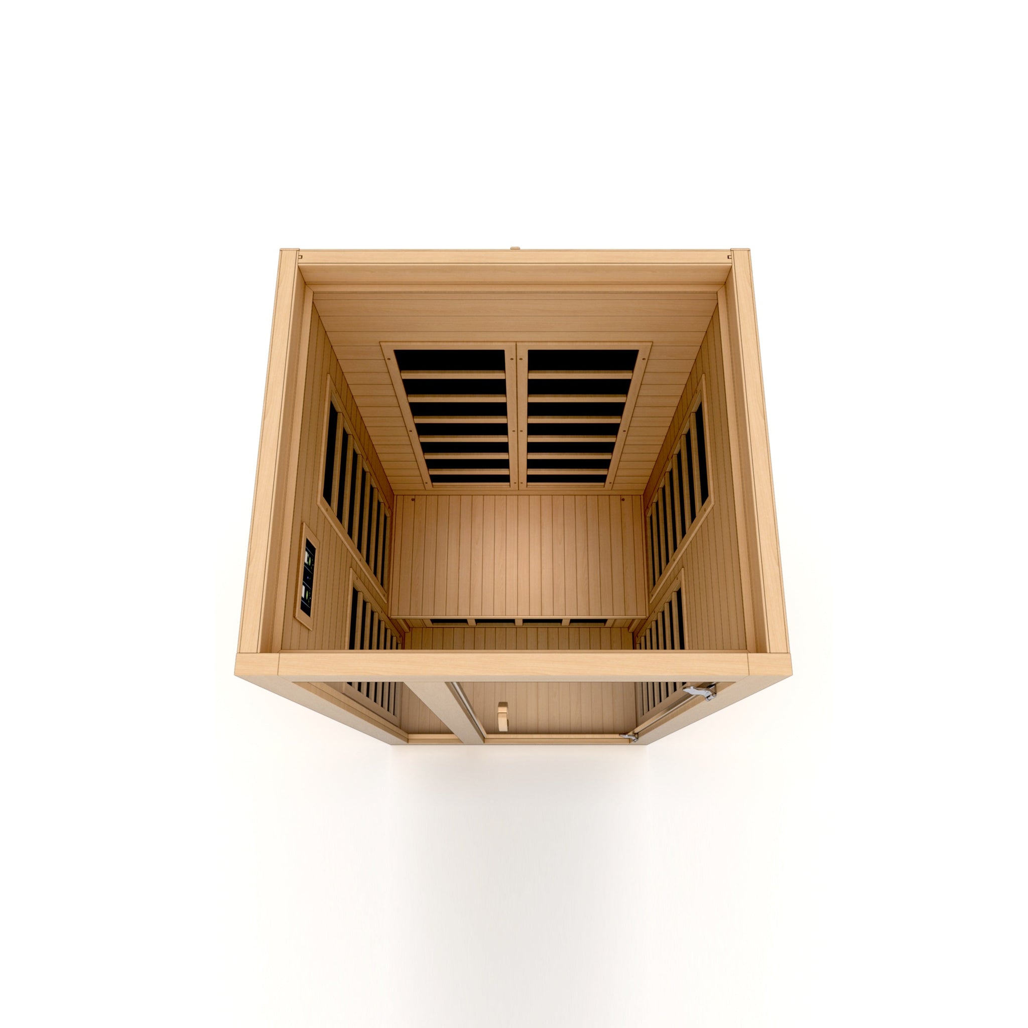 The Dynamic "Gracia" is a space-efficient wellness retreat designed to bring the therapeutic benefits of FAR infrared heat into any home. Crafted from hypoallergenic, reforested Canadian Hemlock, the Gracia is optimized for a luxurious single-user experience but can accommodate up to two people. This model utilizes advanced carbon heating technology to penetrate deep into body tissues, aiding in detoxification, improved circulation, and muscle relief, all within a compact and stylish footprint.